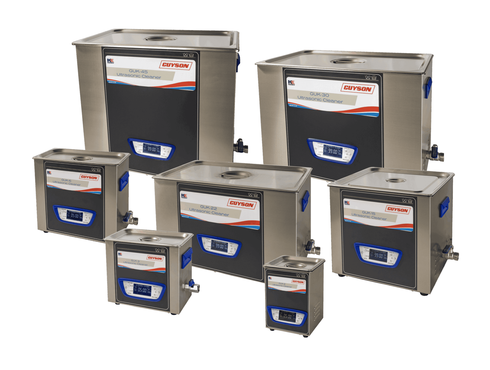 La gamme de bains à ultrasons de table Guyson GUK offre un nettoyage puissant dans un ensemble fiable et abordable. Ils sont disponibles en sept tailles, de 2 à 45 litres, et tous sont équipés d'un affichage LCD facile à utiliser, d'un robinet de vidange et d'un panier et couvercle en acier inoxydable.